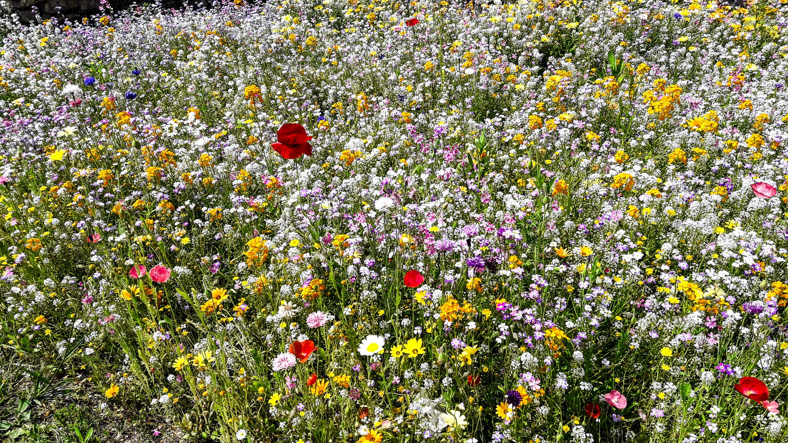 Blühwiesen voller bunter Blüten und Wildkräuter sind für Bienen, insbesondere für Wildbienen, eine wichtige Nahrungsquelle. Außerdem finden sie dort bei guter Pflege auch Baumaterial und Brutrefugien für ihren Nachwuchs.